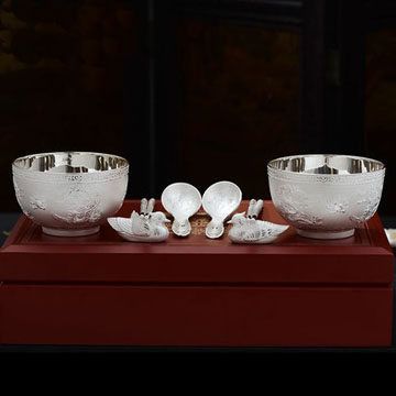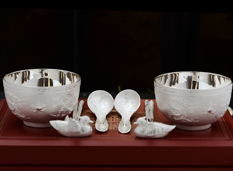 银重:整个套装约(850克),套装包含2个碗,2双筷子,2个勺子,鸳鸯1对;