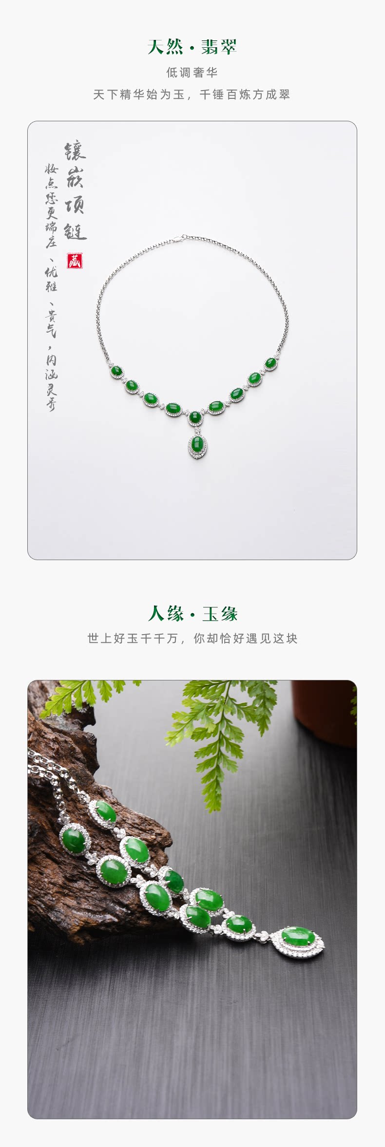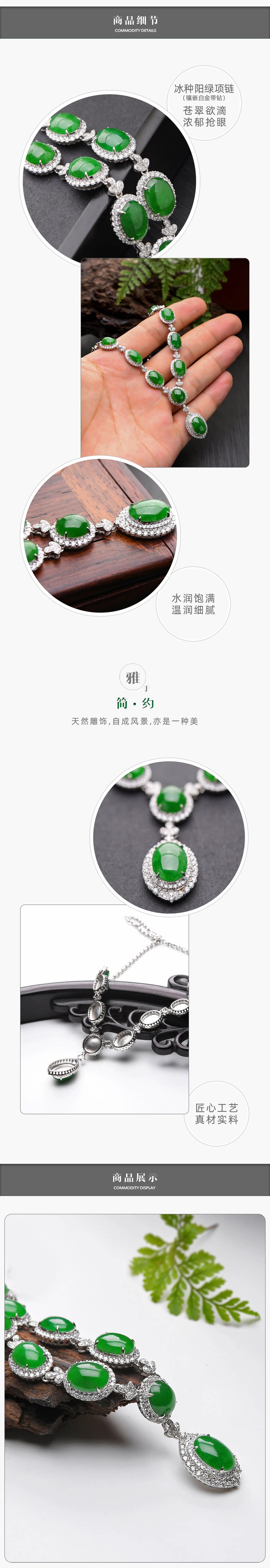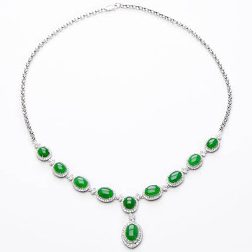【品 牌】豪8印象 【编 号】TC500 【品 名】翡翠项链 【材 质】缅甸翡翠(A货)、18K白金带钻 【产 地】缅甸北部密支那宝石级翡翠矿区 【规 格】含镶金总长254.8mm 大珠子长10.8mm 宽8.0mm 厚2.7mm 【规 格】小珠子长8.4mm 宽6.6mm 厚2.9mm 总颗数10颗 【重 量】约20.8g 【证 书】FHK*** 【网 址】www.giyn.net (云南省珠宝玉石质量监督检验研究院) 【服 务】材质保真、支持复检、分期… 【配 送】质检A货证书、保障卡、精美包装…
